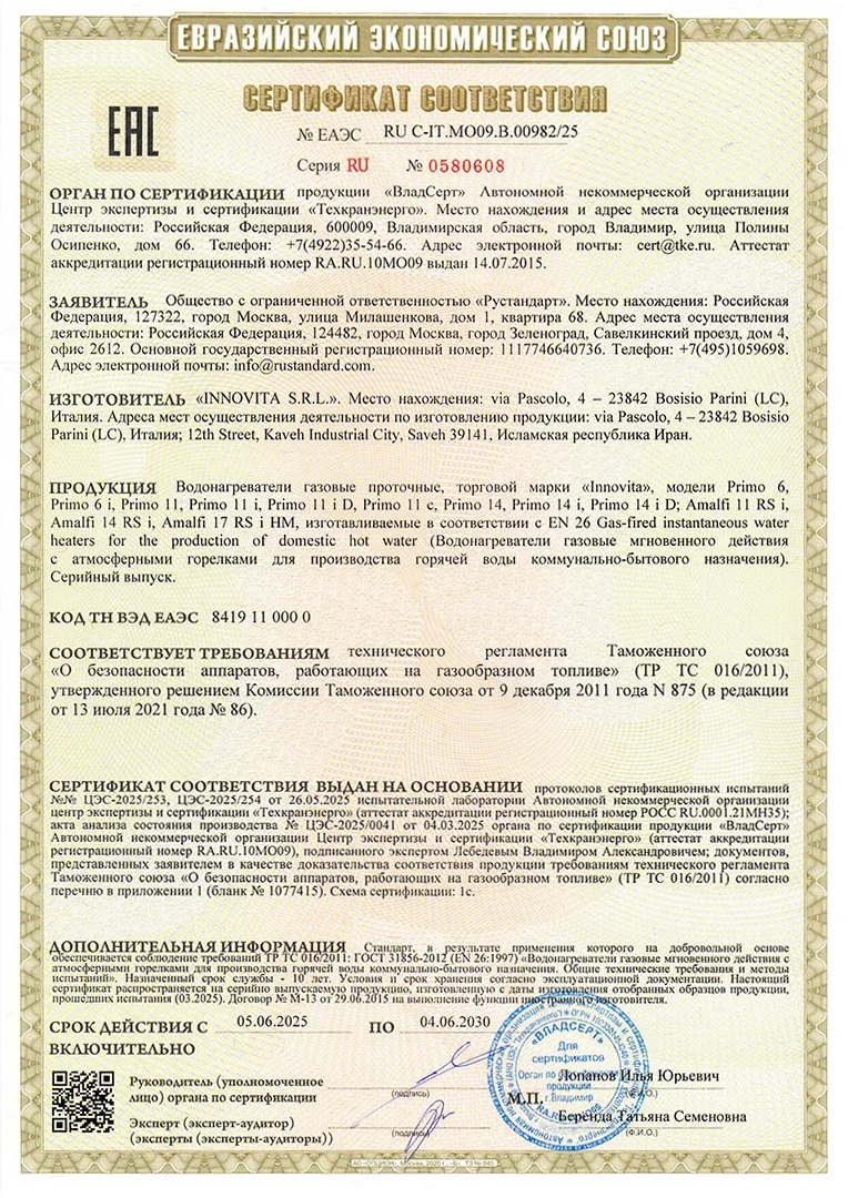 Высокий уровень качества и надежности продукции Innovita, а также соответствие требованиям ТР ТС, подтверждены Декларацией о соответствии.